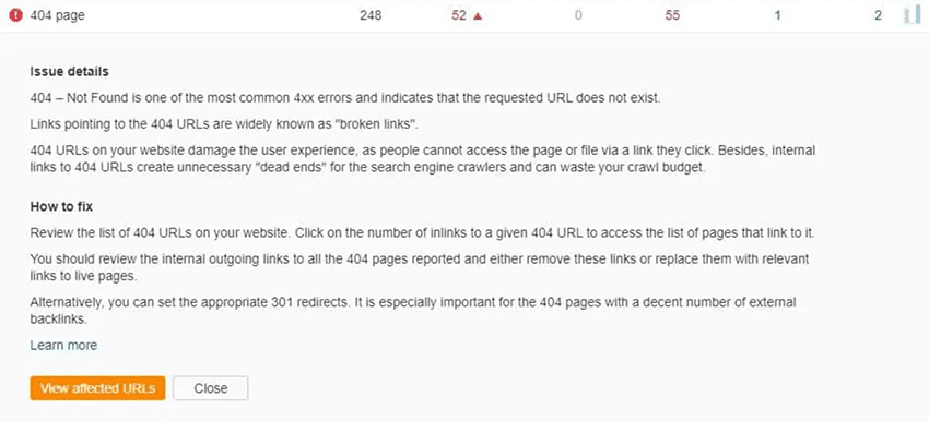 Compared to Ahrefs, SEMrush is easy to understand and use. It provides you enough information to find technical errors and tell how to fix them.