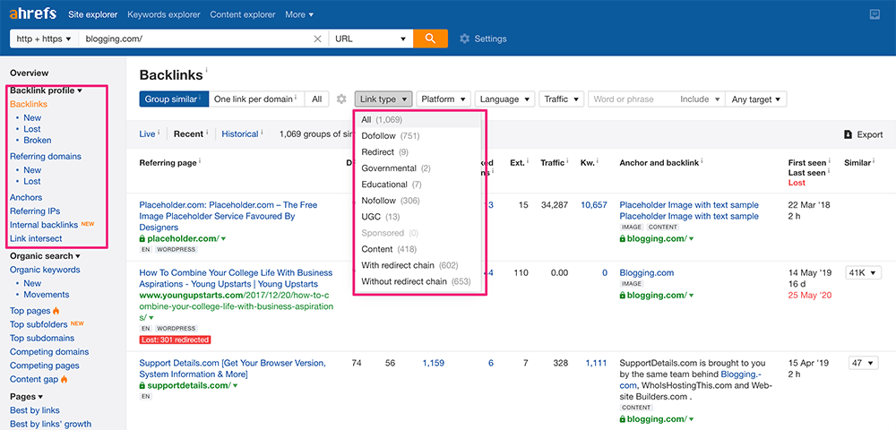 These filters let you deep dive in the backlink profile and find out profitable link building opportunities.