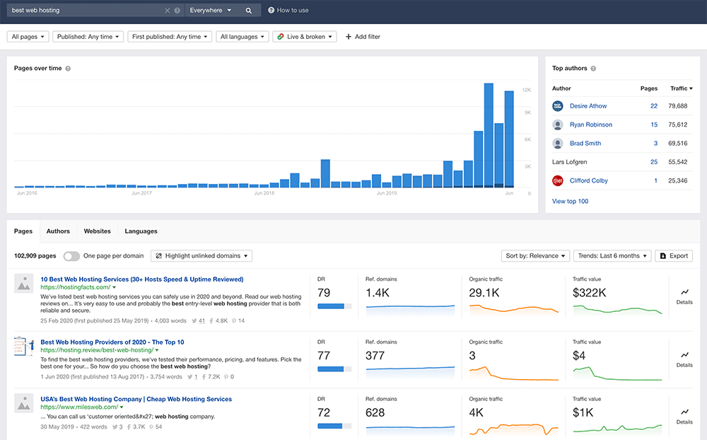 Ahrefs offers an excellent content explorer feature that helps you discover best-performing pages with useful SEO and social metrics.