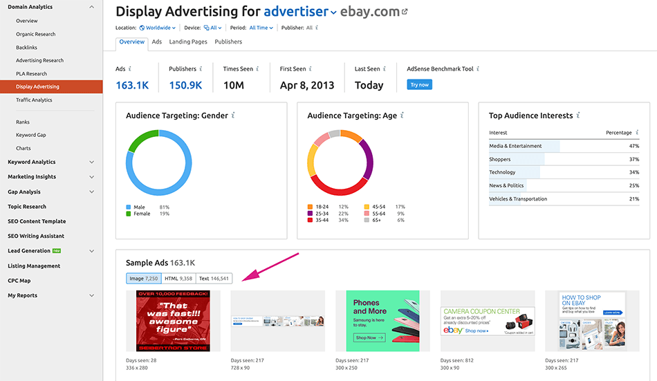 With this tool, you can also analyze your competitor’s banners, text ads, their top publishers, targeting audiences based on age and gender.