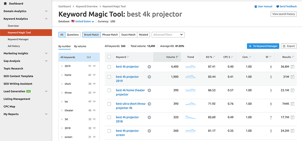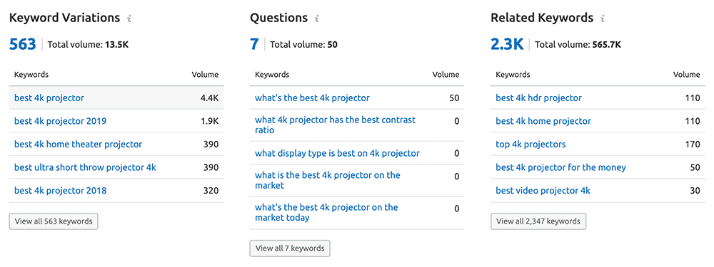 As you can see, for the above example keyword “best 4k projector”, SEMrush tool generates a lot of data including: