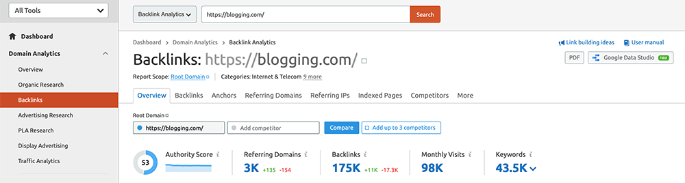 As you can see, Ahrefs picked up 169K backlinks and only 866 referring domains, whereas SEMrush returns 175K backlinks and 3K referring domains for the Blogging.com website.